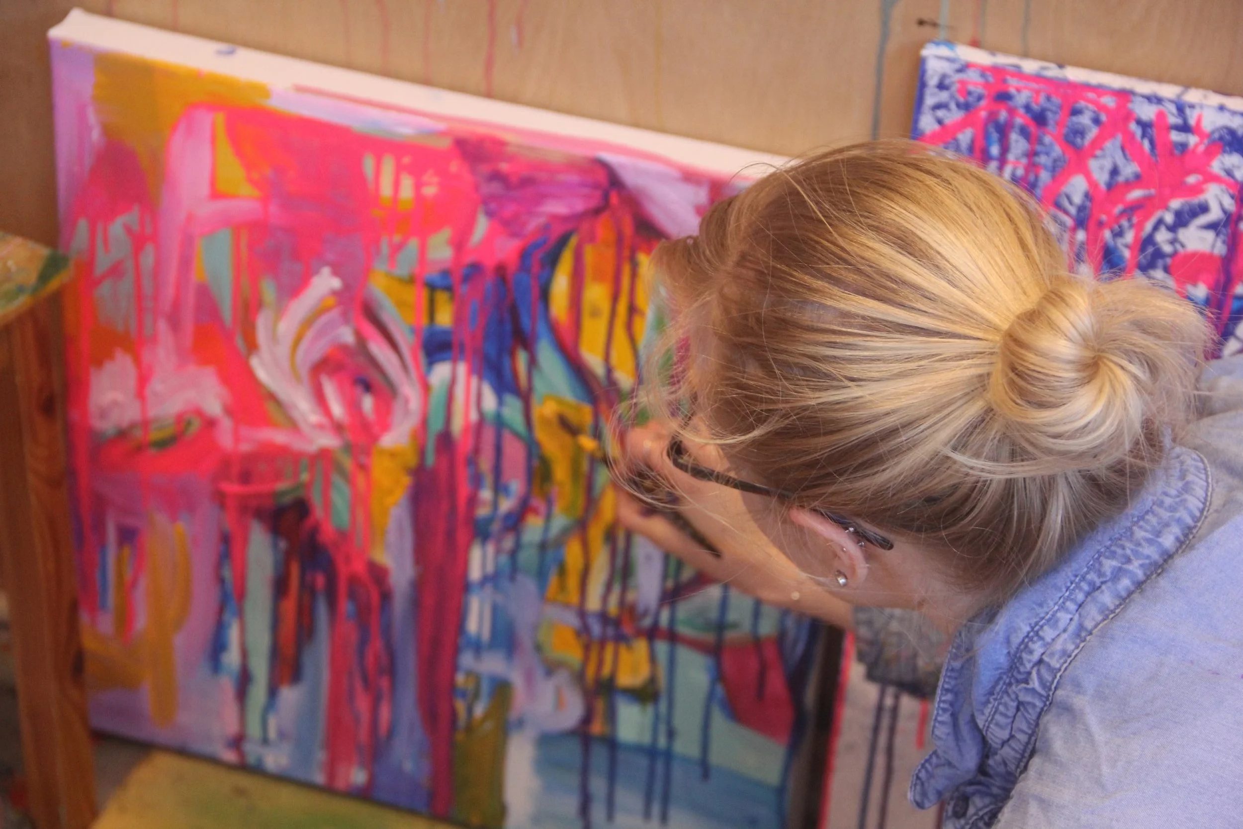 My name is Rebekah Emma. I am a UK based artist, that makes vibrant, abstract art using acrylics on canvas. I studied Art and Primary School Teaching at the University of Reading. Ever since I was 17, I have got lost in the creation of art. It has become an oasis, where time stops and I can just get messy in a world of colour in my little art shed.